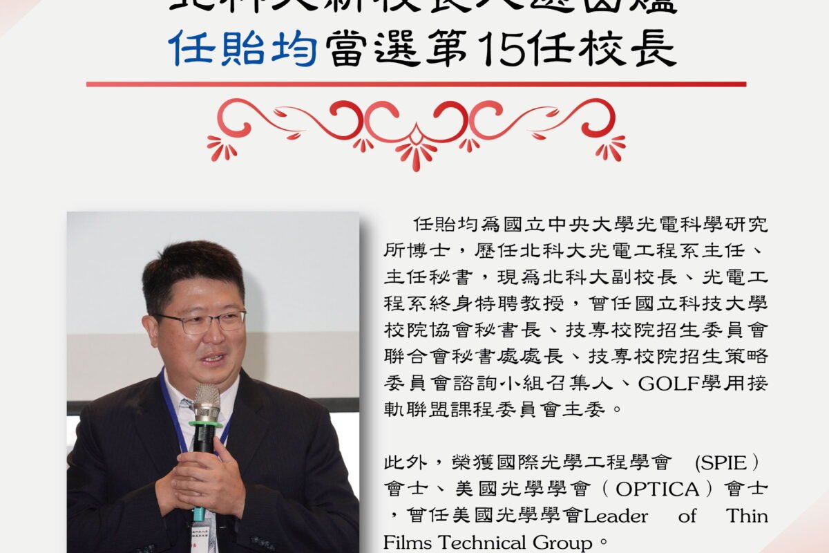 新聞 2025 年 10 月 25 日 北科大新校長人選出爐 任貽均當選第15任校長國立臺北科技大學第十五任校長遴選,歷經五個多月公告、推薦、資格查證、治校理念說明會及投票決選後,今(24)日北科大光電工程系終身特聘教授任貽均獲遴選為新任校長,後續由學校報請教育部聘任,新任校長將於明年2月1日就任。今年4月15日北科大第十五任校長遴選委員會召開第一次會議,並自5月2日至6月2日公開徵求校長人選。經8月13日第二次會議通過資格審查,產生6位校長候選人。隨後9月16日於校內綜合科館世雄感恩演藝廳進行「第十五任校長候選人治校理念說明會」,候選人發表治校理念並與校內教職員工生交流意見。10月7日由校務會議代表以無記名方式對個別候選人行使校內意向表達,6位均通過同意票門檻。校長遴選委員會今(24)日召開第三次會議,邀請候選人依序進行治校理念說明與詢答,由召集人國立臺灣大學名譽教授黃榮村主持,經出席委員無記名投票表決,選定任貽均為新任校長當選人。任貽均為國立中央大學光電科學研究所博士,歷任北科大光電工程系主任、主任秘書,現為北科大副校長、光電工程系終身特聘教授,曾任國立科技大學校院協會秘書長、技專校院招生委員會聯合會秘書處處長、技專校院招生策略委員會諮詢小組召集人、GOLF學用接軌聯盟課程委員會主委。此外,榮獲國際光學工程學會(SPIE)會士、美國光學學會(OPTICA)會士,曾任美國光學學會Leader of Thin Films Technical Group。近年校內行政上,任貽均推動成立校務研究中心,主責個資稽核計畫與宣導,建立內部控制自評系統,並推動校園整建,打造優質校園與教學研究場域,自107年迄今督導完成超過60項重要整建及新建工程。在治校理念中,任貽均提出的願景,是打造以學生為本、研究導向、數位驅動、永續共榮的現代科技大學,獲多數遴選委員認同。國立臺北科技大學第15任校長遴選專區:https://per.ntut.edu.tw/p/403-1025-2985.php?Lang=zh-tw 分享