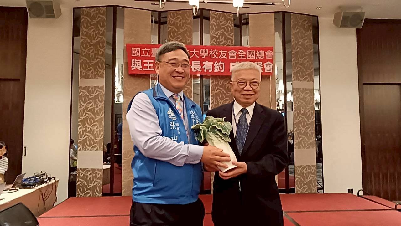 感恩餐會最動人的時刻,便是致贈紀念品。校友總會與各地校友會理事長聯合獻上國立故宮博物院授權典藏:翠王白菜(法藍磁製作,內裝玉山陳高十六年高粱酒)。這份禮物象徵堅韌、永續的北科精神。當翠王白菜由總會長親手交到校長手中,這一刻,是北科人共同的驕傲。