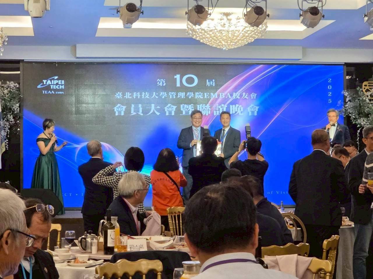 活動 2025 年 12 月 15 日 臺北科技大學管理學院EMBA校友會第十屆會員大會暨聯誼晚會時間:114 年12月13日(星期六)18:00地點:彭園新板館1樓圖文/產業推手編輯部整理適逢新北耶誕城活動期間,板橋市區人潮湧動,為確保會員大會順利進行,臺北科技大學管理學院EMBA校友會,於活動前即多次提醒校友提早出門、避開尖峰時段。這份細膩的安排,不僅展現主辦單位的周全思慮,也讓與會校友在熱鬧的城市節慶中,感受到一份屬於EMBA的溫暖與從容。當晚,第十屆會員大會暨聯誼晚會,於彭園新板館隆重登場,來自各屆EMBA校友、師長及各地區校友會理事長暨校友代表齊聚一堂,在溫馨而熱烈的氣氛中,共同見證TEAA邁入第十年的重要里程碑。校歌齊唱 揭開承先啟後序幕隨著音樂響起,第九屆EMBA校友會全體幹部依序進場,全場起立高唱校歌,象徵對母校的認同,也宣布會員大會正式開始。這一刻,不只是例行流程,更是世代交替、責任交接的起點。真情告白 為第九屆畫下句點第九屆理事長陳秉豐上台致詞,他首先感謝歷屆理事長與學長姐的信任與支持,讓自己有機會承擔服務校友的重任;也特別向管理學院師長致上深深謝意,回憶在接任之初,正是在師長與團隊的陪伴下,才能一步步穩健前行。「如果沒有大家的幫忙,我今天不會站在這個舞台上。」陳秉豐理事長數度向台下致意,感謝第九屆理監事與幹部群全年無給職的投入,尤其點名秘書長與核心團隊,為籌備本次活動付出無數心力,甚至徹夜未眠,只為呈現最完善的成果。他也回顧一年來慧智講堂、跨域交流與百大經理人等成果,認為這些成績屬於整個團隊,而非個人。十年不易 世代同行談及TEAA即將邁入第十年,陳秉豐理事長感性表示,從第一屆到第八屆歷任理事長奠定深厚基礎,讓校友會能夠穩健成長。他特別邀請歷屆理事長起立接受全場掌聲,象徵十年來一棒接一棒的付出與承擔。「我不說安全下莊,我說華麗轉身。」一句話,道盡卸任前的豁達與自信,也展現EMBA校友會領導者特有的氣度,留下令人難忘的身影。 緊接著由工業會和塑膠中心獻花,其中多位貴賓上台祝賀,包括:新世代傳承聯誼會會長蔡尚澄。塑膠產業共學會秘書長陳舜莉。新師董聯盟創辦人蕭瑞宏、新創總會團體聯誼會會長簡岑穎、ESG華人企業永續聯盟理事長吳佰鴻等人。EMBA是連結校友與社會的重要平台隨後,副校長任貽均致詞時,特別向現場EMBA校友與貴賓致意,並肯定歷任理事長在短短一年任期中,皆展現高度能量與行動力。他表示,每年參與EMBA理事長交接時,總會有「明明做得這麼好,卻只做一年」的感觸,但這正反映出 EMBA人才輩出、一屆比一屆更強的事實。任副校長也指出,EMBA近年在招生與品牌形象上持續創新,無論是以社群媒體呈現跨域、跨境學習特色,或強調「學長姐即在校生最重要的資源」,都清楚展現北科大EMBA的核心價值。他特別肯定管理學院團隊在AI、SDGs等議題上的積極投入,讓科技應用不只停留在技術層面,更成為情感與智慧傳承的媒介。「把對親人的思念、對前人智慧的尊重,透過科技一代一代傳下去,這是非常有意義的事情。」任副校長的分享,也引發現場共鳴。各界祝福齊聚 見證交接與傳承管理學院院長范書愷、執行長陳育威及校友總會理事長張山立亦先後致詞,總會長指出,北科大校友力量之所以能在各界發光發熱,關鍵在於彼此不分系所、不分世代的合作精神。他也期許EMBA校友持續扮演橋梁角色,與校友總會攜手,為母校與社會創造更大的正向影響。EMBA校友會在凝聚校友、串聯各地區校友會及促進跨界合作上的關鍵角色。在范書愷院長監交下,第九屆理事長陳秉豐正式將印信交付予第十屆理事長林志成,象徵責任與使命的延續。新任理事長並於致詞中提到將全力以赴,不負所託。冰雕傳承儀式 凝結十年心血晚會高潮之一,為歷屆理事長共同參與的傳承儀式。十位理事長依序將象徵使命的顏料注入冰雕,色彩在冰中交融,凝結成十年心血的具象化呈現。隨後合唱〈世界第一等〉,唱出「共擔使命、不分你我」的TEAA精神。十年為起點 迎向下一段旅程在全場大合照、感謝狀頒發、樂團演出與歡唱交流中,晚會在熱烈氣氛下逐步推向尾聲。笑聲與歌聲交織的不只是歡樂,更是校友之間深厚的信任與情誼。對TEAA而言,第十屆會員大會不只是回顧過去,更是迎向未來的起點。十年薪火,一棒接一棒,在世代傳承中,EMBA校友會將持續凝聚力量,為母校、為社會,寫下下一個值得期待的十年。 分享