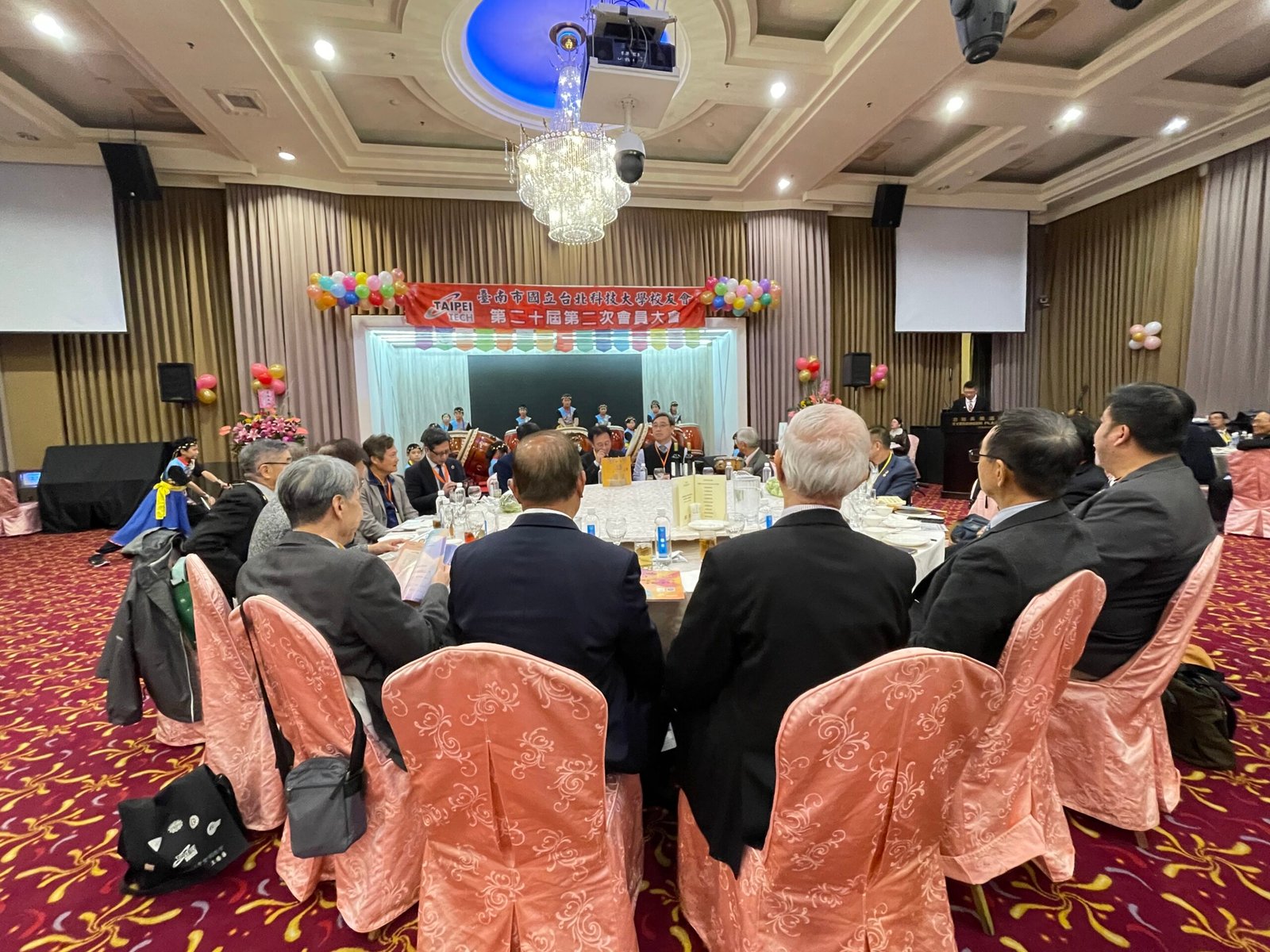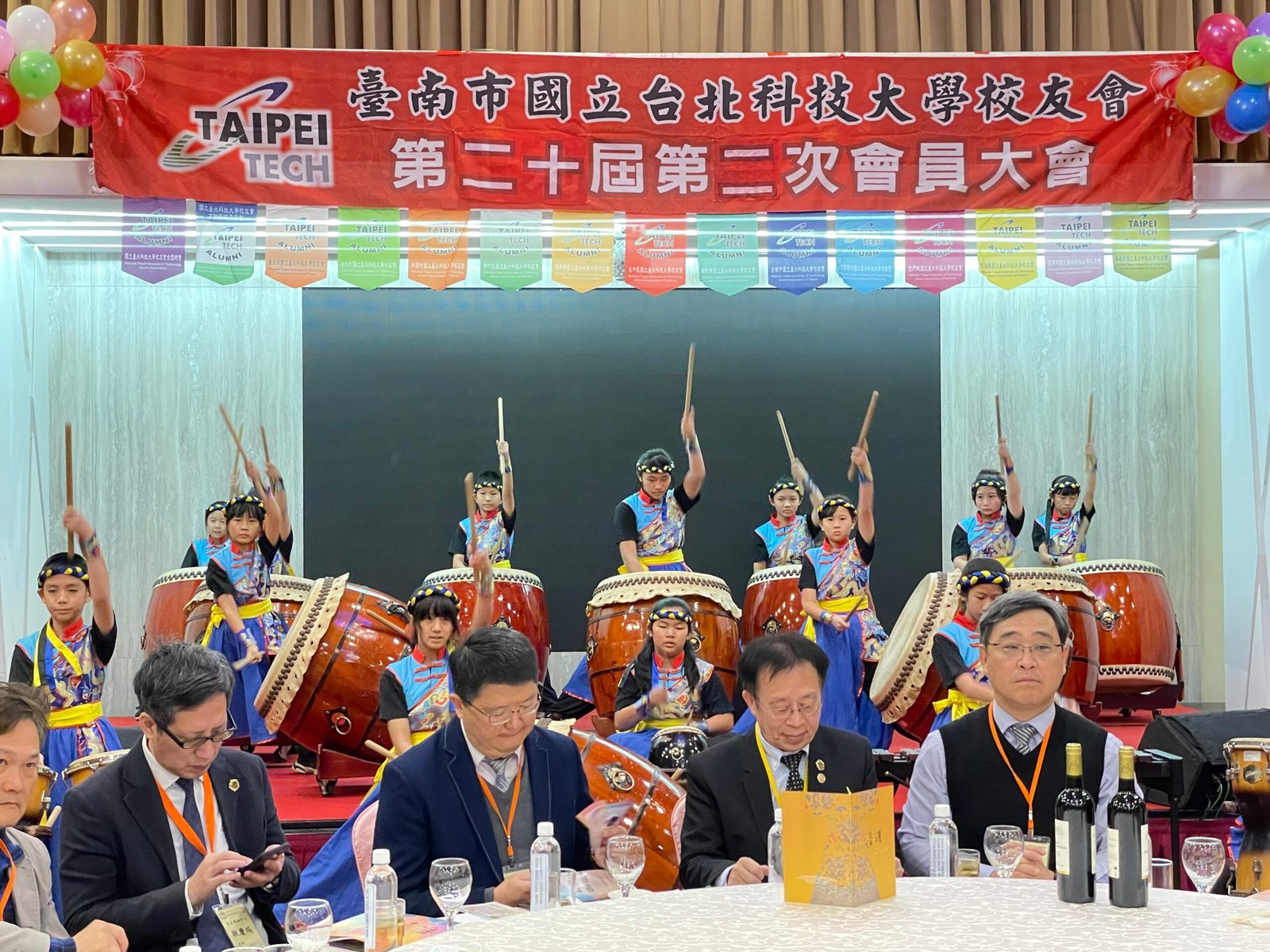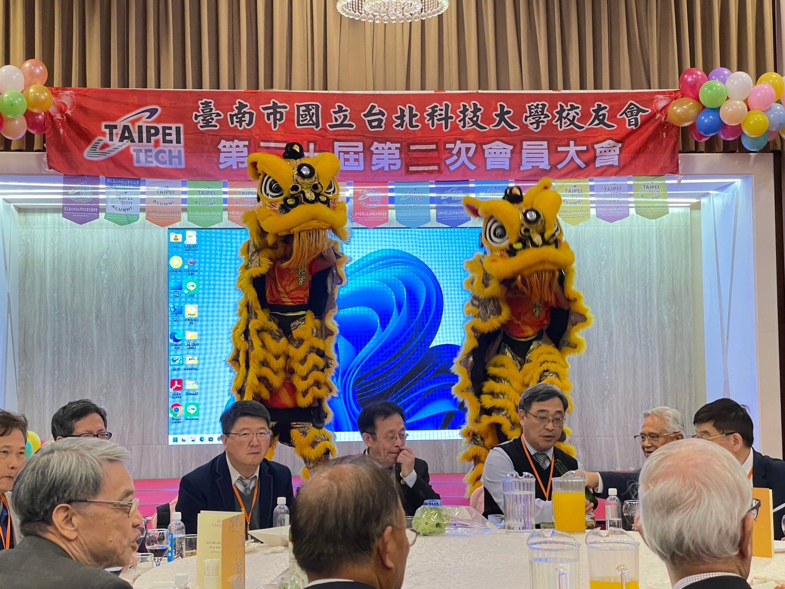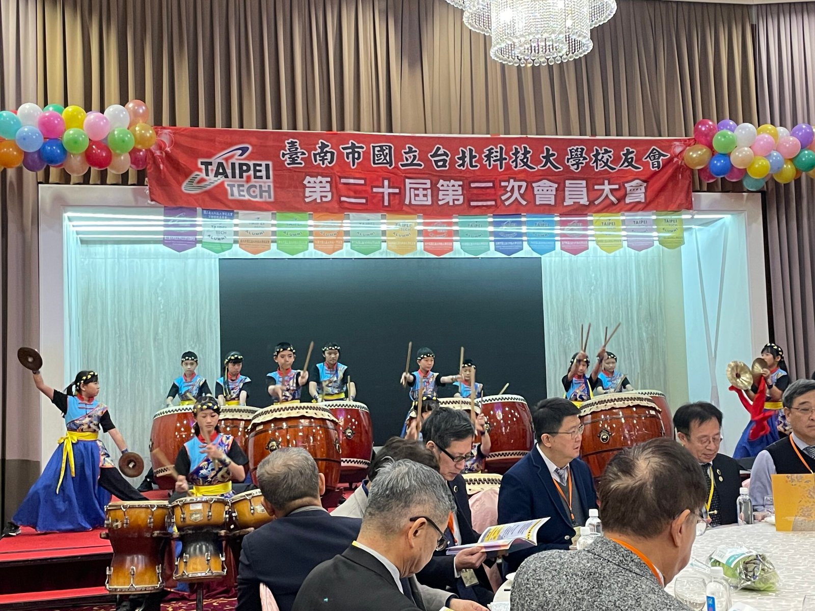 午宴正式揭幕,由台南德高國小鼓術團擔綱開場。該團隊連續15年榮獲台南市傳統藝術比賽冠軍,以磅礡鼓聲震撼全場,展現堅毅與團結的精神,博得滿堂彩。因應年節氣氛,主辦單位安排舞龍舞獅與財神爺繞場,校友們爭相合影,喜氣洋洋。節目高潮由周定邦校友帶來「台灣唸歌」演出,結合恆春民謠吟唱,別具特色,隨後森巴女郎與小喇叭演奏輪番登場,現場氣氛熱烈。