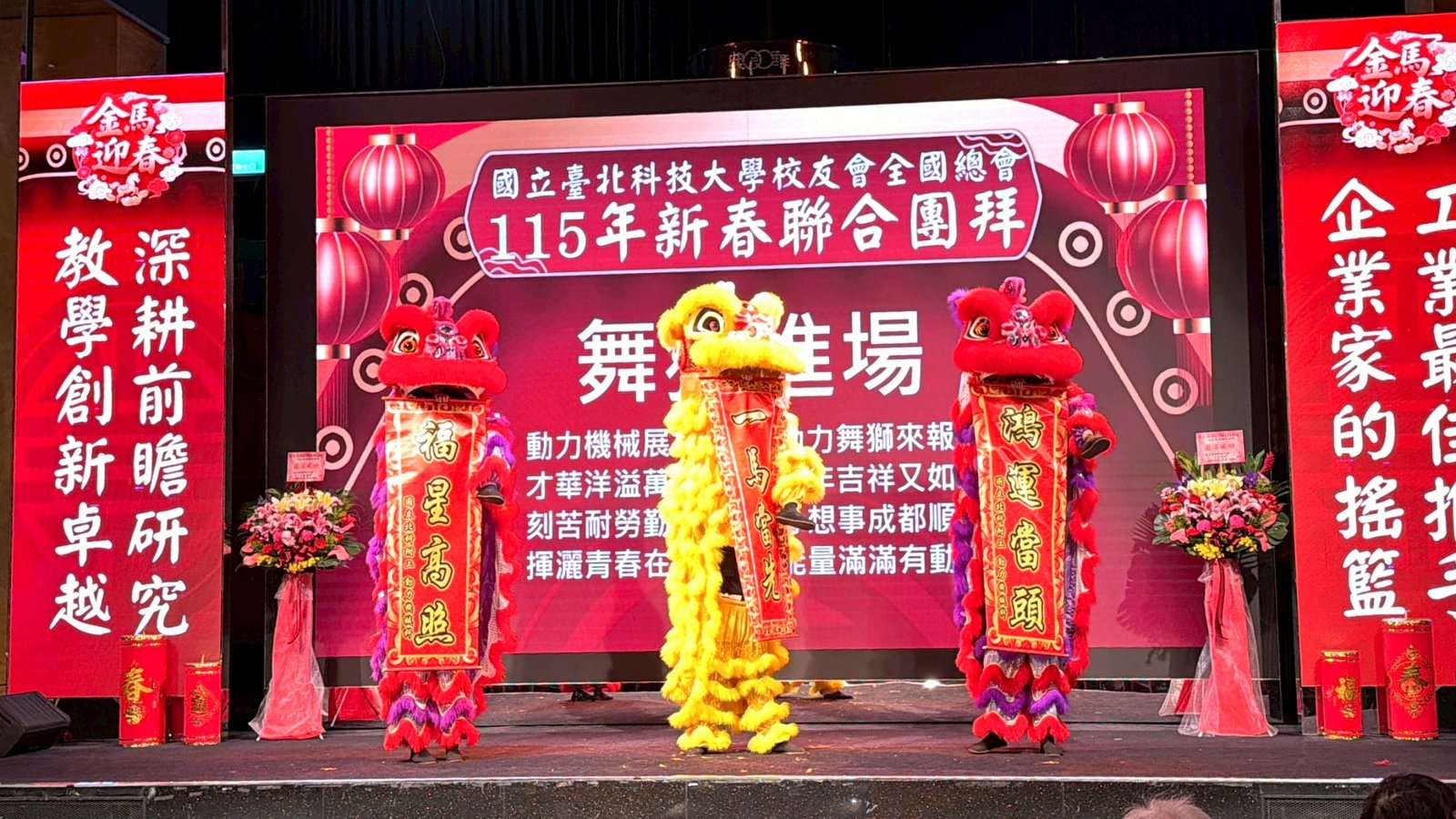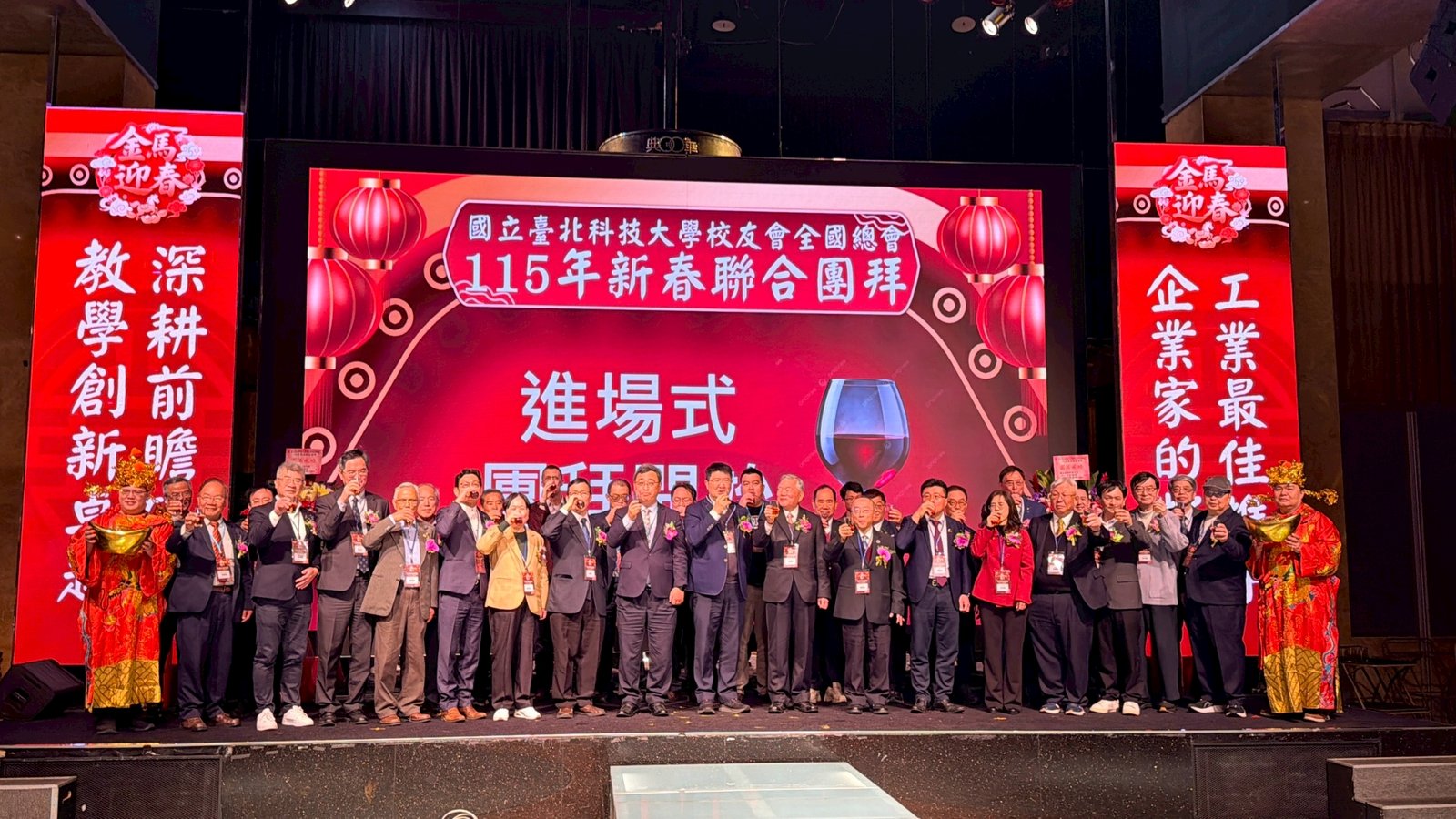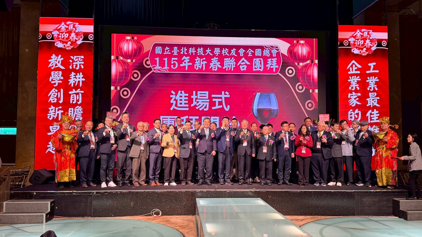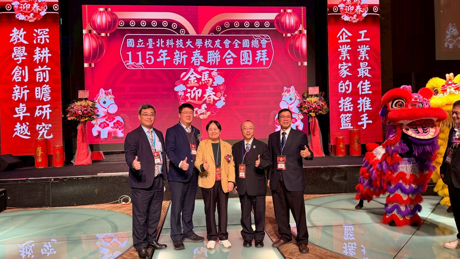 活動 2026 年 3 月 8 日 國立臺北科技大學校友會全國總會 115年新春聯合團拜 時間:115年3月7(星期六)12:00 地點:大直典華6樓 花田盛事廳 台北市中山區植福路8號 圖文/產業推手編輯部整理 凝聚北科力量 共迎嶄新一年 在上午理監事會議及會員代表大會順利完成後,來自全省各地的校友、師長及貴賓齊聚一堂,舉行「115年新春聯合團拜」。以溫馨熱鬧的團拜活動迎接新的一年。活動除新春祝福外,也透過音樂表演與交流聯誼,展現北科校友團結互助的精神。 舞獅迎春 揭開團拜序幕 活動在熱鬧的舞獅表演中揭開序幕。由北科附工動力機械團隊帶來的舞獅演出充滿活力,象徵新年的喜氣與祝福。表演者長期刻苦練習,在舞台上展現青春與力量,也為整場活動注入滿滿能量。隨後財神爺進場,為現場帶來象徵財運與好運的祝福。貴賓及各地區校(系)友會理事長,走上星光大道,大進場的氣勢,接受全場的歡呼,全體在台上舉杯敬酒,象徵新春熱鬧的氣氛。 貴賓雲集 北科校友情誼凝聚 校友總會新春團拜在溫馨熱鬧中展開。總會長致詞時表示,非常高興能與各地校友齊聚一堂,共同迎接新的一年,並向所有蒞臨的貴賓、師長與校友表達誠摯歡迎與新春祝福。今年團拜活動貴賓雲集,除母校校長任貽均親自出席外,精英會理事長曾國華、總統府資政沈榮津校友、台北市副市長李四川以及新北市議員戴瑋姍等也到場共襄盛舉,使活動更添光彩。總會長表示,來自各地校友齊聚一堂,正是北科大家庭最珍貴的時刻,也讓團拜宛如一場北科人的大團圓。他指出,北科大長年培育科技與產業人才,校友遍布科技、企業與公共服務等領域,許多人在產業界扮演關鍵角色。校友總會的重要使命,就是凝聚各地校友力量,促進校友與母校及彼此之間的連結,共同為社會與產業創造更大價值。適逢馬年,總會長也期勉校友如駿馬奔騰,在各自領域持續努力,同時保持穩健與從容的步伐,讓北科人的影響力持續擴展。 致詞完畢後,總會長捐贈新台幣100萬元,作為校務發展基金。這項捐贈不僅代表校友對母校的支持,也象徵北科校友回饋教育、支持人才培育的精神。 母校展望 穩健推動校務發展 任貽均校長在致詞中表示,每年的校友總會新春團拜都是非常重要的時刻。來自各地區、各分會以及各系所的校友齊聚一堂,不僅是校友情誼的象徵,也是母校與校友之間最緊密的連結。校長提到,自己在2月1日正式接下校長重任後,隨即迎來馬年的開始。未來將與副校長及行政團隊共同努力,以穩健的步伐推動校務發展,期盼帶領北科大邁向新的高峰。他也感謝校友長期對母校的支持與關心,並期望未來在校友力量的協助下,持續深化產學合作與國際交流,讓北科大的影響力持續提升。 精英會曾國華理事長在致詞中,也向所有校友表達新春祝福,期盼在新的一年裡,校友事業順利、家庭幸福,同時祝福母校校務蒸蒸日上。 校友才藝展現 午宴氣氛熱絡 午宴活動中也安排多場精彩表演。傑出校友卓世雄董事長與夫人帶來歌唱演出,以動人歌聲與校友分享音樂之美。卓世雄校友畢業於紡織工程科,目前為知勉工業董事長,並成立慈善基金會長期投入公益,展現企業家回饋社會的典範。此外,被譽為「北科之光」的世界舞后郭淑貞也登台表演,優雅舞姿贏得滿場掌聲。 公益義賣與籃球隊成立 展現校友活力 活動現場也舉辦銀河酒莊「感恩釀」公益義賣活動,透過校友企業推出的產品,將所得用於成立「台北科技大學校友籃球隊」活動基金。該球隊由曾在校隊或職業聯賽效力的校友組成,未來將代表北科大參與台北聯大四校籃球賽,並透過慈善籃球賽,提升校譽與推動公益活動。 校友張京越則帶來精彩演唱,以渾厚歌聲炒熱氣氛。而雄發樂團薩克斯風的演出,更為午宴增添懷舊氛圍,多首經典歌曲讓校友們沉浸在音樂之中。校友「台北市李四川副市長」因公務繁忙,此時親臨會場,頓時引起騷動,他在致詞時表示,希望有機會能擴大為新北市民服務。而校友也爭相與他合照,李副市長成為人形立牌的有趣場面。北科人情誼 延續不斷 隨後卡拉OK時間,理事長們開唱〈你是我的兄弟〉,溫馨的歌聲象徵校友情誼歷久彌新。在活動尾聲,總會長率領工作團隊上台致意與合唱「期待再相會」,為本次新春團拜畫下圓滿句點。透過這場溫馨又熱鬧的聚會,北科校友再次凝聚情感與力量。未來,在母校與校友總會的共同努力下,北科人的影響力將持續在產業、科技與社會各領域發光發熱,共同迎向更加精彩的一年。 分享