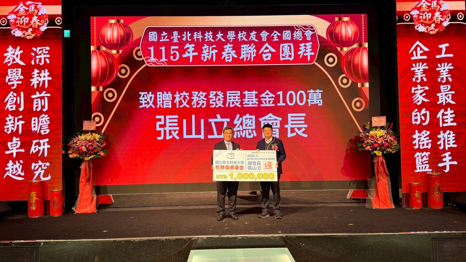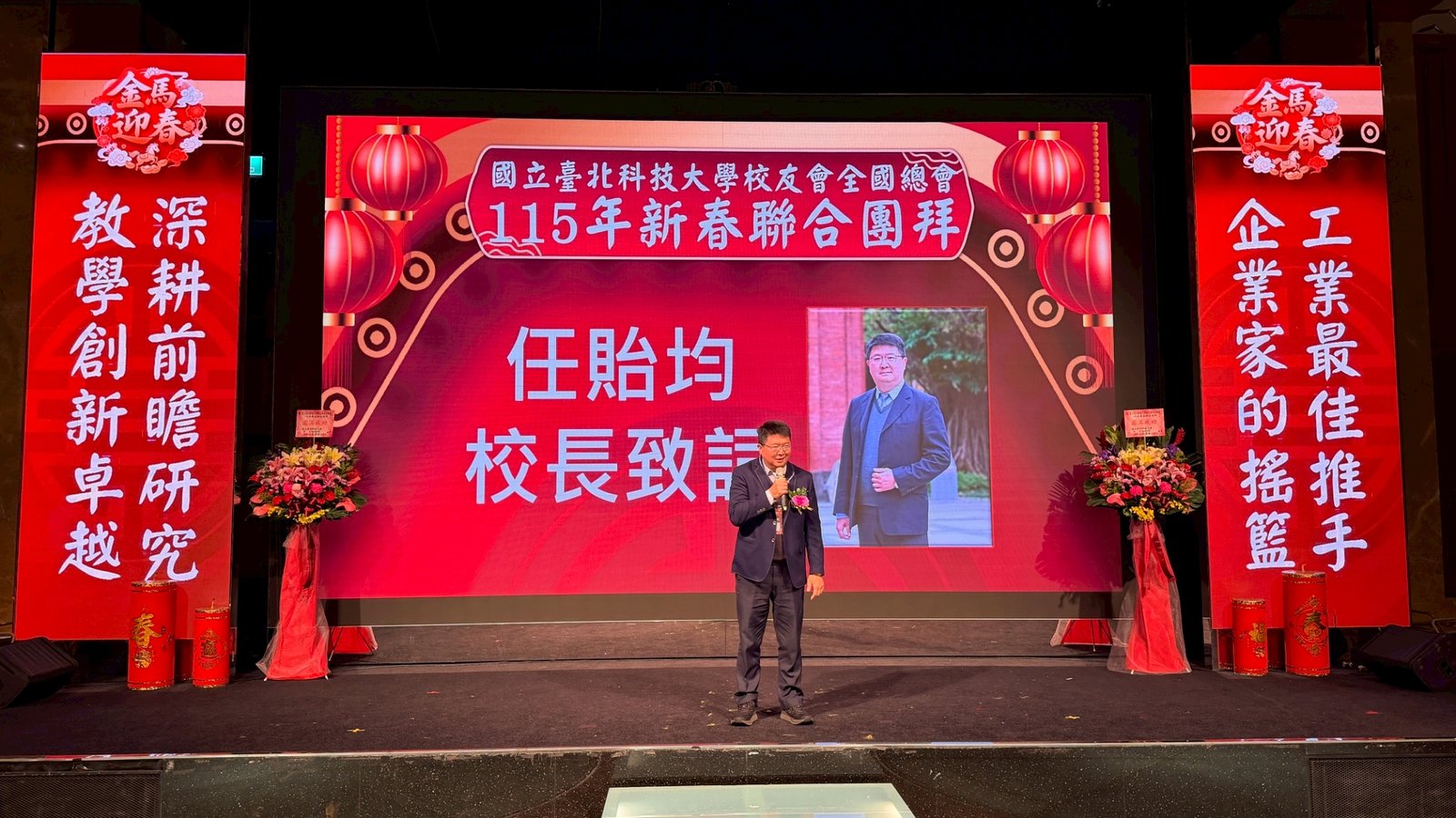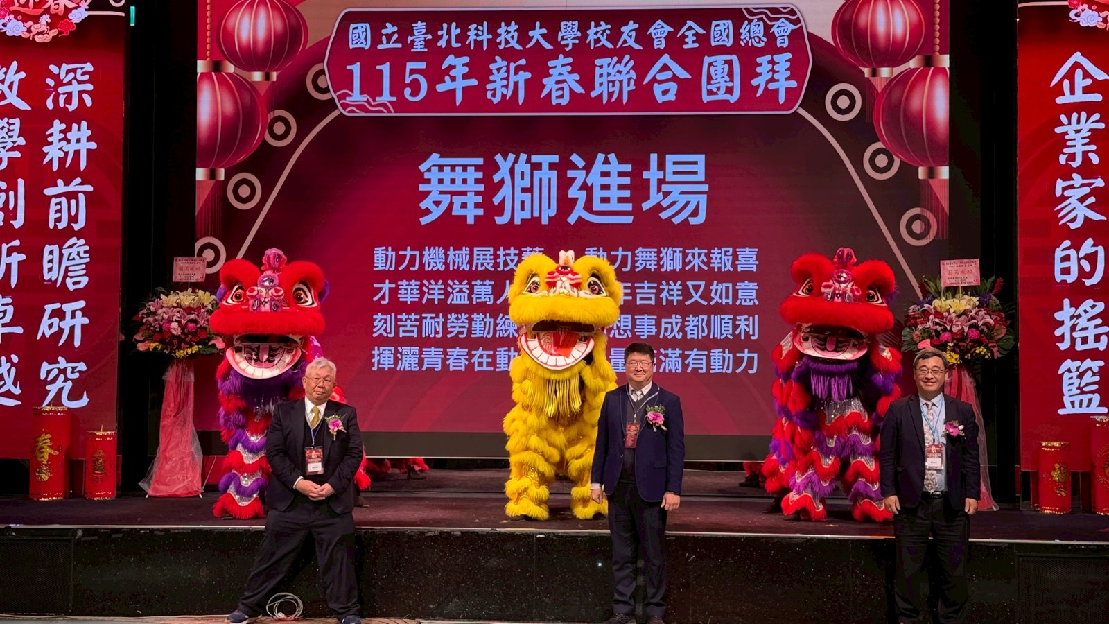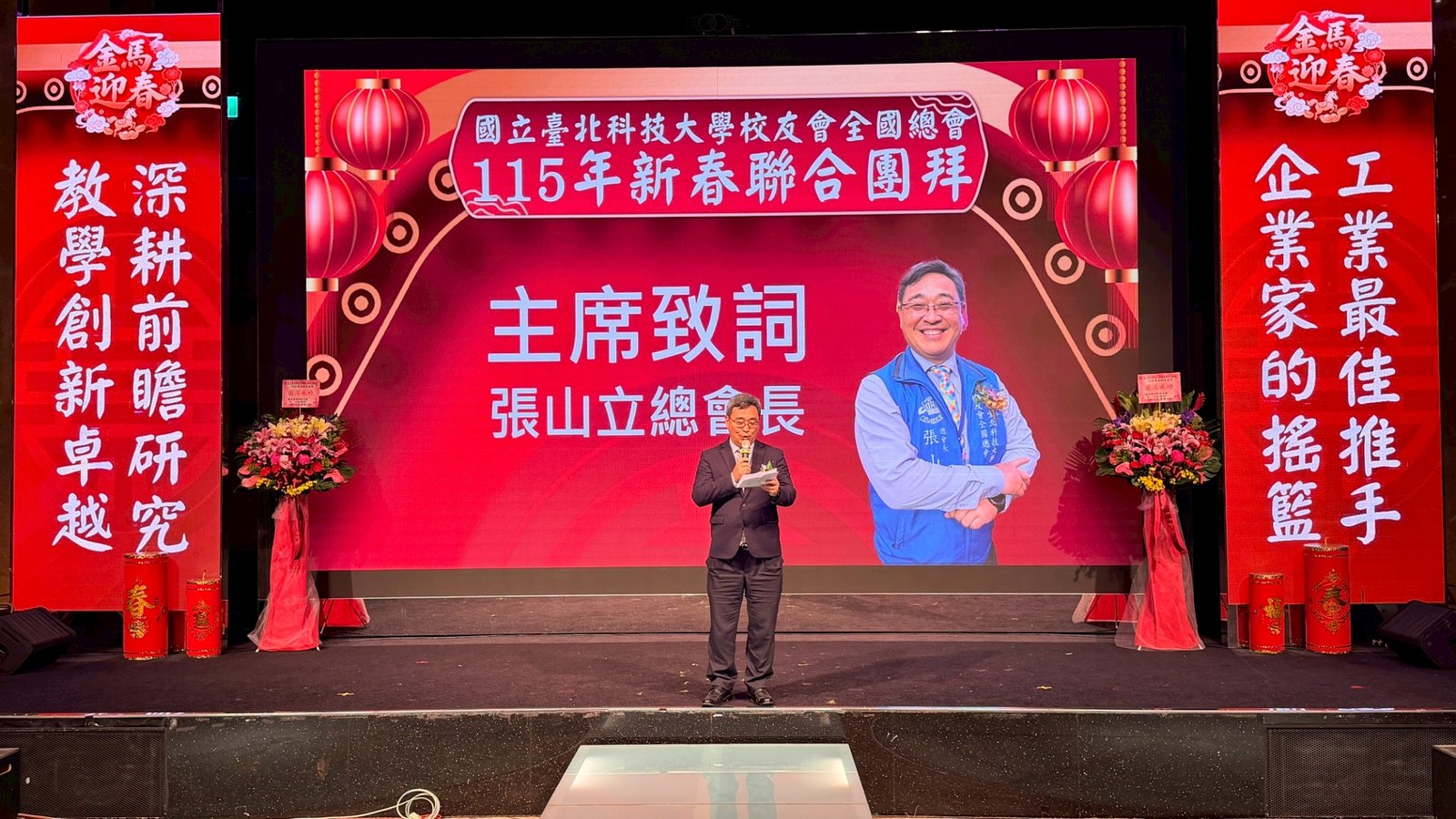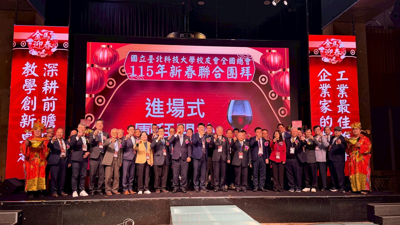 活動 2026 年 3 月 8 日 國立臺北科技大學校友會全國總會 115年新春聯合團拜 時間:115年3月7(星期六)12:00 地點:大直典華6樓 花田盛事廳 台北市中山區植福路8號 圖文/產業推手編輯部整理 凝聚北科力量 共迎嶄新一年 在上午理監事會議及會員代表大會順利完成後,來自全省各地的校友、師長及貴賓齊聚一堂,舉行「115年新春聯合團拜」。以溫馨熱鬧的團拜活動迎接新的一年。活動除新春祝福外,也透過音樂表演與交流聯誼,展現北科校友團結互助的精神。 舞獅迎春 揭開團拜序幕 活動在熱鬧的舞獅表演中揭開序幕。由北科附工動力機械團隊帶來的舞獅演出充滿活力,象徵新年的喜氣與祝福。表演者長期刻苦練習,在舞台上展現青春與力量,也為整場活動注入滿滿能量。隨後財神爺進場,為現場帶來象徵財運與好運的祝福。貴賓及各地區校(系)友會理事長,走上星光大道,大進場的氣勢,接受全場的歡呼,全體在台上舉杯敬酒,象徵新春熱鬧的氣氛。 貴賓雲集 北科校友情誼凝聚 校友總會新春團拜在溫馨熱鬧中展開。總會長致詞時表示,非常高興能與各地校友齊聚一堂,共同迎接新的一年,並向所有蒞臨的貴賓、師長與校友表達誠摯歡迎與新春祝福。今年團拜活動貴賓雲集,除母校校長任貽均親自出席外,精英會理事長曾國華、總統府資政沈榮津校友、台北市副市長李四川以及新北市議員戴瑋姍等也到場共襄盛舉,使活動更添光彩。總會長表示,來自各地校友齊聚一堂,正是北科大家庭最珍貴的時刻,也讓團拜宛如一場北科人的大團圓。他指出,北科大長年培育科技與產業人才,校友遍布科技、企業與公共服務等領域,許多人在產業界扮演關鍵角色。校友總會的重要使命,就是凝聚各地校友力量,促進校友與母校及彼此之間的連結,共同為社會與產業創造更大價值。適逢馬年,總會長也期勉校友如駿馬奔騰,在各自領域持續努力,同時保持穩健與從容的步伐,讓北科人的影響力持續擴展。 致詞完畢後,總會長捐贈新台幣100萬元,作為校務發展基金。這項捐贈不僅代表校友對母校的支持,也象徵北科校友回饋教育、支持人才培育的精神。 母校展望 穩健推動校務發展 任貽均校長在致詞中表示,每年的校友總會新春團拜都是非常重要的時刻。來自各地區、各分會以及各系所的校友齊聚一堂,不僅是校友情誼的象徵,也是母校與校友之間最緊密的連結。校長提到,自己在2月1日正式接下校長重任後,隨即迎來馬年的開始。未來將與副校長及行政團隊共同努力,以穩健的步伐推動校務發展,期盼帶領北科大邁向新的高峰。他也感謝校友長期對母校的支持與關心,並期望未來在校友力量的協助下,持續深化產學合作與國際交流,讓北科大的影響力持續提升。 精英會曾國華理事長在致詞中,也向所有校友表達新春祝福,期盼在新的一年裡,校友事業順利、家庭幸福,同時祝福母校校務蒸蒸日上。 校友才藝展現 午宴氣氛熱絡 午宴活動中也安排多場精彩表演。傑出校友卓世雄董事長與夫人帶來歌唱演出,以動人歌聲與校友分享音樂之美。卓世雄校友畢業於紡織工程科,目前為知勉工業董事長,並成立慈善基金會長期投入公益,展現企業家回饋社會的典範。此外,被譽為「北科之光」的世界舞后郭淑貞也登台表演,優雅舞姿贏得滿場掌聲。 公益義賣與籃球隊成立 展現校友活力 活動現場也舉辦銀河酒莊「感恩釀」公益義賣活動,透過校友企業推出的產品,將所得用於成立「台北科技大學校友籃球隊」活動基金。該球隊由曾在校隊或職業聯賽效力的校友組成,未來將代表北科大參與台北聯大四校籃球賽,並透過慈善籃球賽,提升校譽與推動公益活動。 校友張京越則帶來精彩演唱,以渾厚歌聲炒熱氣氛。而雄發樂團薩克斯風的演出,更為午宴增添懷舊氛圍,多首經典歌曲讓校友們沉浸在音樂之中。校友「台北市李四川副市長」因公務繁忙,此時親臨會場,頓時引起騷動,他在致詞時表示,希望有機會能擴大為新北市民服務。而校友也爭相與他合照,李副市長成為人形立牌的有趣場面。北科人情誼 延續不斷 隨後卡拉OK時間,理事長們開唱〈你是我的兄弟〉,溫馨的歌聲象徵校友情誼歷久彌新。在活動尾聲,總會長率領工作團隊上台致意與合唱「期待再相會」,為本次新春團拜畫下圓滿句點。透過這場溫馨又熱鬧的聚會,北科校友再次凝聚情感與力量。未來,在母校與校友總會的共同努力下,北科人的影響力將持續在產業、科技與社會各領域發光發熱,共同迎向更加精彩的一年。 分享