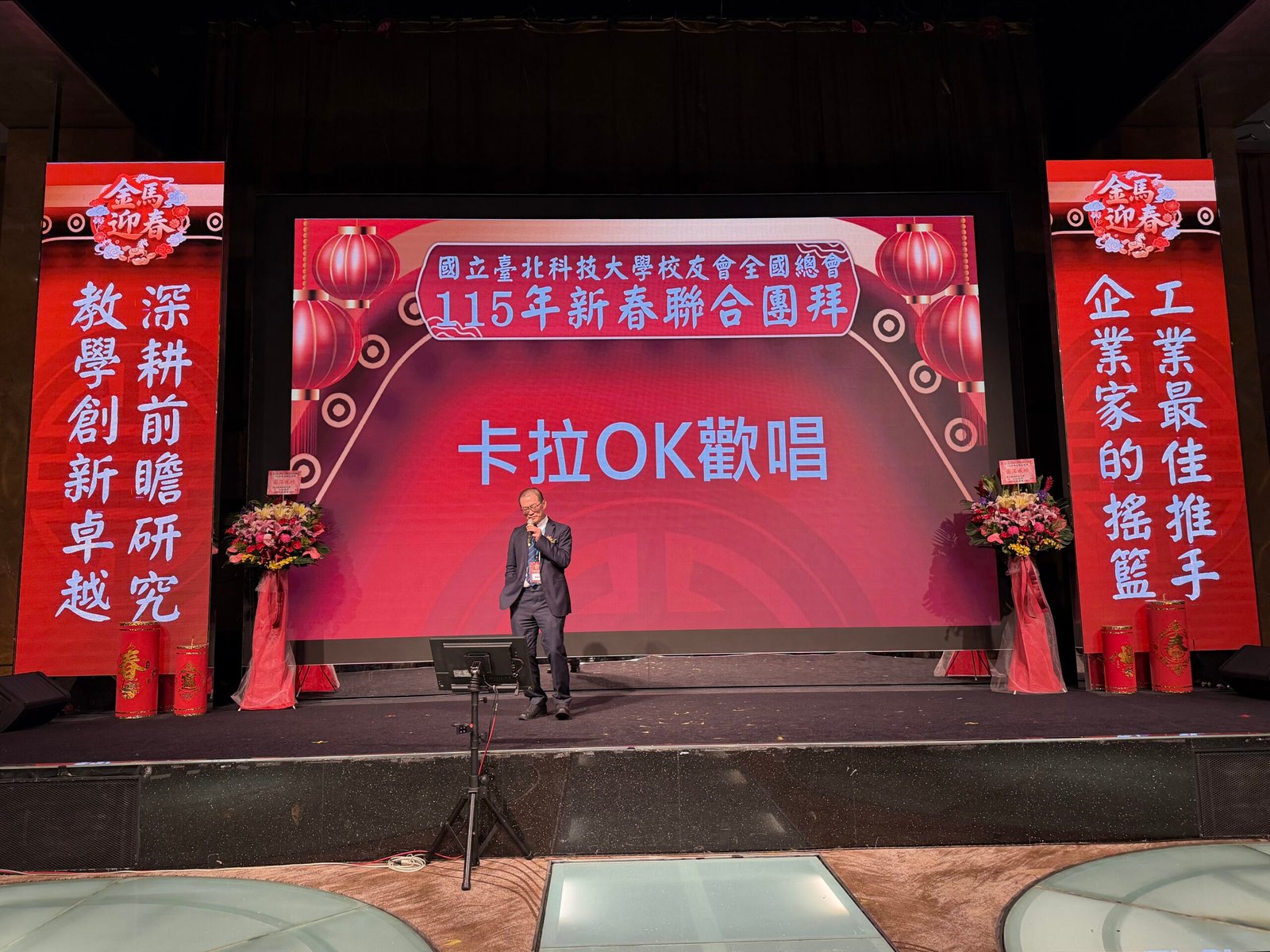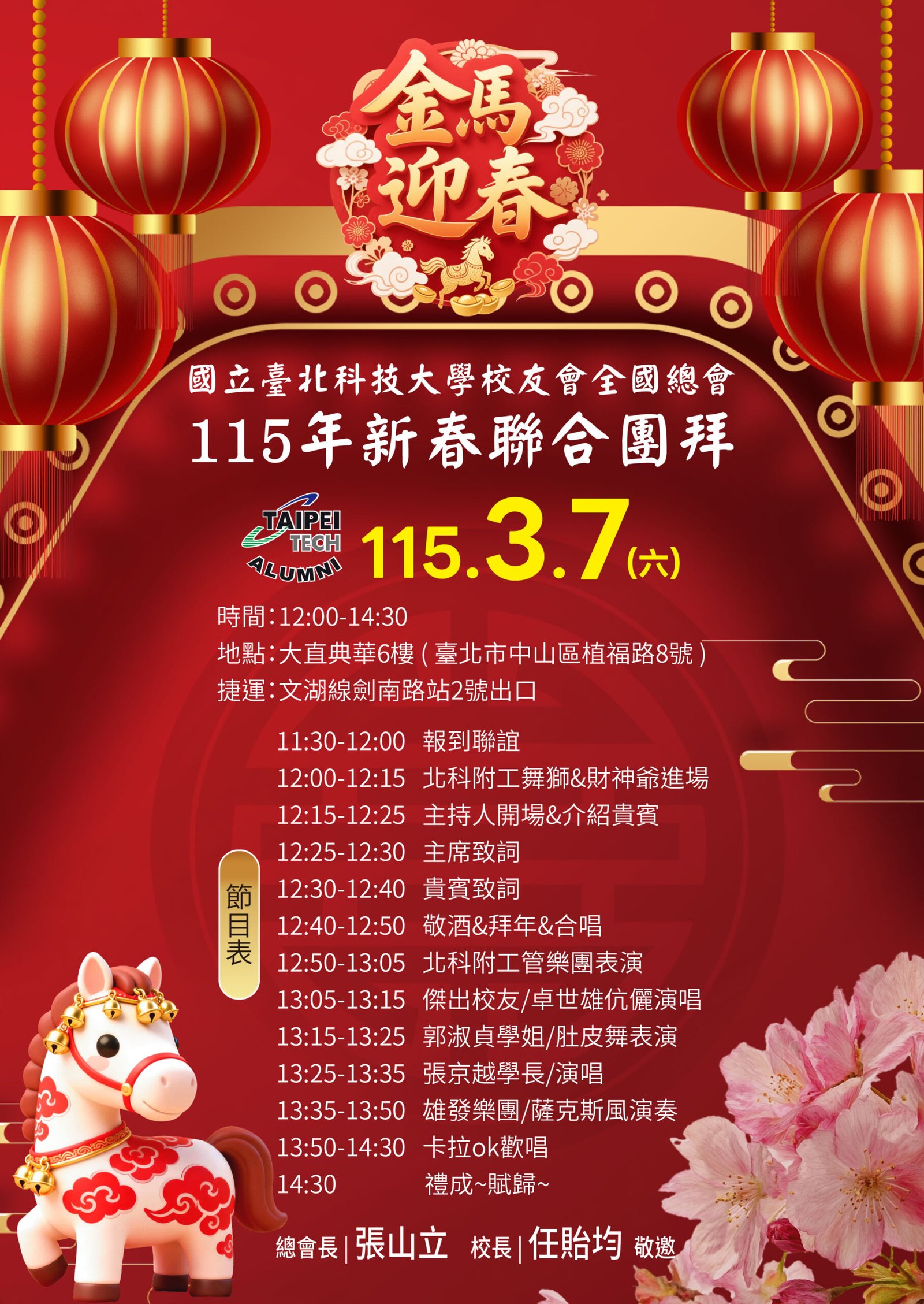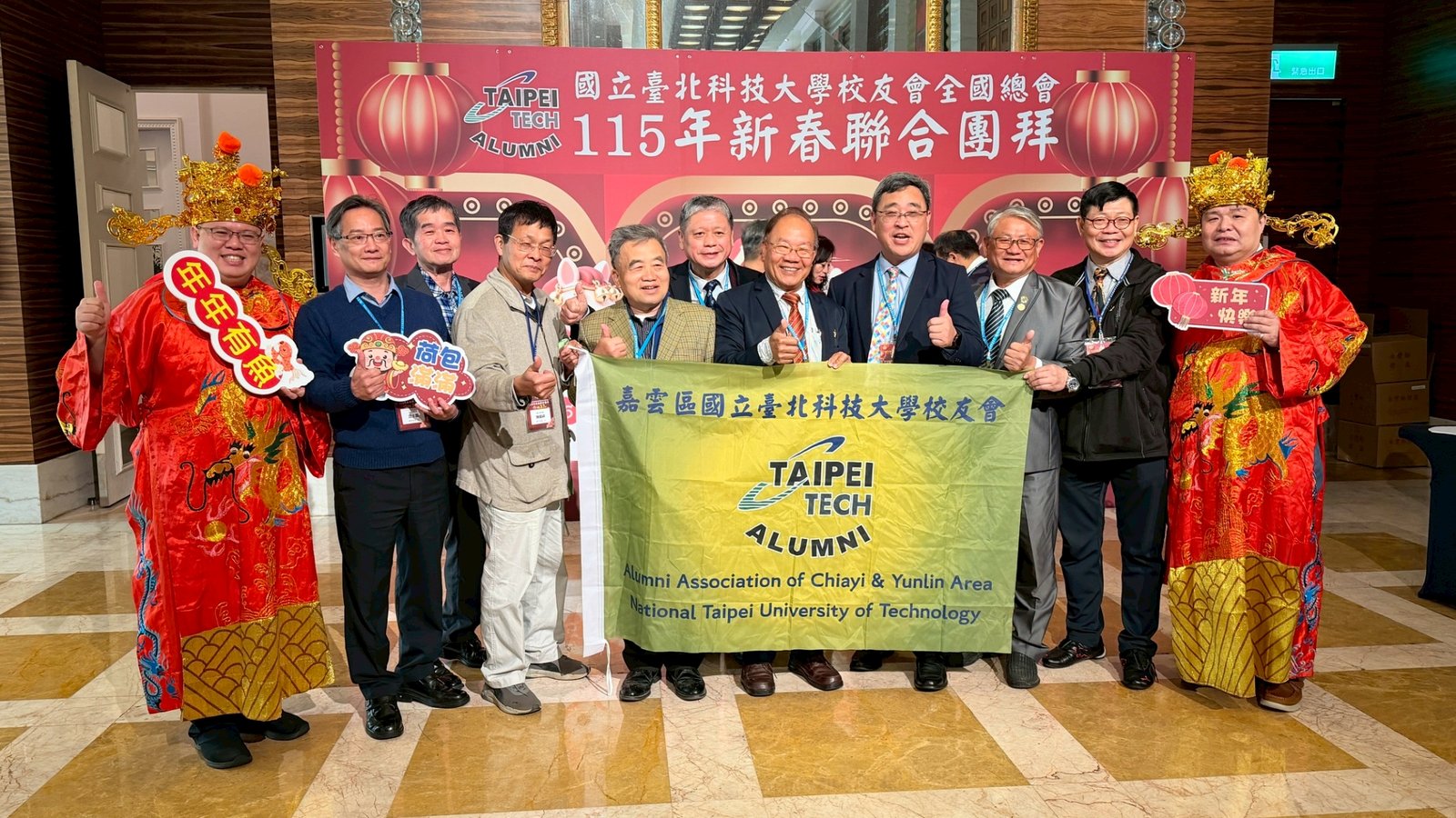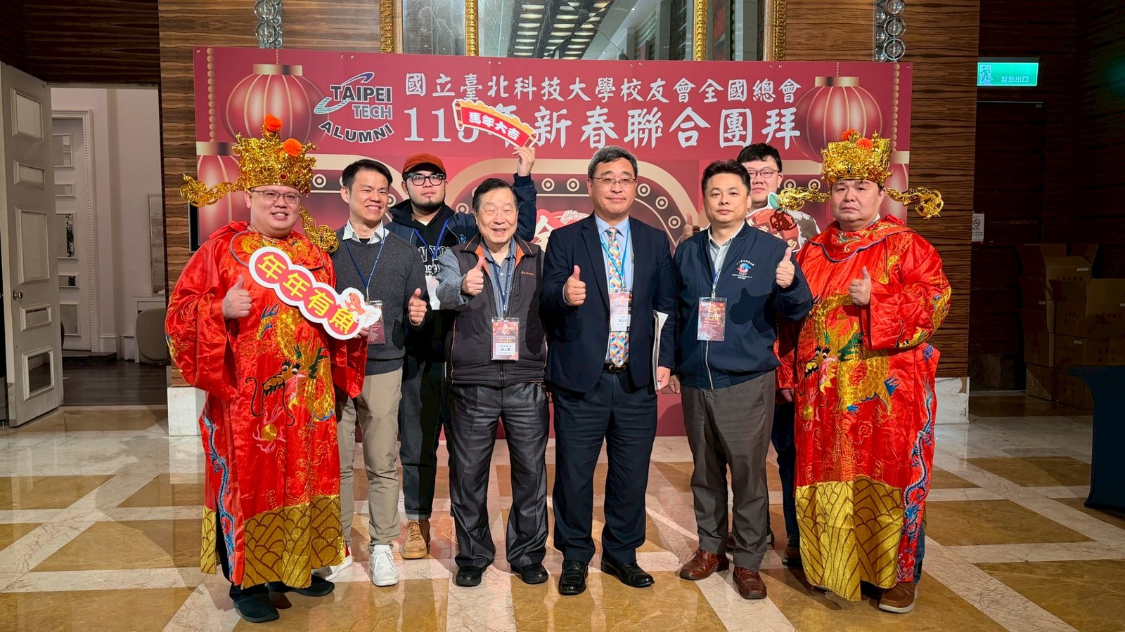 活動 2026 年 3 月 8 日 國立臺北科技大學校友會全國總會 115年新春聯合團拜 時間:115年3月7(星期六)12:00 地點:大直典華6樓 花田盛事廳 台北市中山區植福路8號 圖文/產業推手編輯部整理 凝聚北科力量 共迎嶄新一年 在上午理監事會議及會員代表大會順利完成後,來自全省各地的校友、師長及貴賓齊聚一堂,舉行「115年新春聯合團拜」。以溫馨熱鬧的團拜活動迎接新的一年。活動除新春祝福外,也透過音樂表演與交流聯誼,展現北科校友團結互助的精神。 舞獅迎春 揭開團拜序幕 活動在熱鬧的舞獅表演中揭開序幕。由北科附工動力機械團隊帶來的舞獅演出充滿活力,象徵新年的喜氣與祝福。表演者長期刻苦練習,在舞台上展現青春與力量,也為整場活動注入滿滿能量。隨後財神爺進場,為現場帶來象徵財運與好運的祝福。貴賓及各地區校(系)友會理事長,走上星光大道,大進場的氣勢,接受全場的歡呼,全體在台上舉杯敬酒,象徵新春熱鬧的氣氛。 貴賓雲集 北科校友情誼凝聚 校友總會新春團拜在溫馨熱鬧中展開。總會長致詞時表示,非常高興能與各地校友齊聚一堂,共同迎接新的一年,並向所有蒞臨的貴賓、師長與校友表達誠摯歡迎與新春祝福。今年團拜活動貴賓雲集,除母校校長任貽均親自出席外,精英會理事長曾國華、總統府資政沈榮津校友、台北市副市長李四川以及新北市議員戴瑋姍等也到場共襄盛舉,使活動更添光彩。總會長表示,來自各地校友齊聚一堂,正是北科大家庭最珍貴的時刻,也讓團拜宛如一場北科人的大團圓。他指出,北科大長年培育科技與產業人才,校友遍布科技、企業與公共服務等領域,許多人在產業界扮演關鍵角色。校友總會的重要使命,就是凝聚各地校友力量,促進校友與母校及彼此之間的連結,共同為社會與產業創造更大價值。適逢馬年,總會長也期勉校友如駿馬奔騰,在各自領域持續努力,同時保持穩健與從容的步伐,讓北科人的影響力持續擴展。 致詞完畢後,總會長捐贈新台幣100萬元,作為校務發展基金。這項捐贈不僅代表校友對母校的支持,也象徵北科校友回饋教育、支持人才培育的精神。 母校展望 穩健推動校務發展 任貽均校長在致詞中表示,每年的校友總會新春團拜都是非常重要的時刻。來自各地區、各分會以及各系所的校友齊聚一堂,不僅是校友情誼的象徵,也是母校與校友之間最緊密的連結。校長提到,自己在2月1日正式接下校長重任後,隨即迎來馬年的開始。未來將與副校長及行政團隊共同努力,以穩健的步伐推動校務發展,期盼帶領北科大邁向新的高峰。他也感謝校友長期對母校的支持與關心,並期望未來在校友力量的協助下,持續深化產學合作與國際交流,讓北科大的影響力持續提升。 精英會曾國華理事長在致詞中,也向所有校友表達新春祝福,期盼在新的一年裡,校友事業順利、家庭幸福,同時祝福母校校務蒸蒸日上。 校友才藝展現 午宴氣氛熱絡 午宴活動中也安排多場精彩表演。傑出校友卓世雄董事長與夫人帶來歌唱演出,以動人歌聲與校友分享音樂之美。卓世雄校友畢業於紡織工程科,目前為知勉工業董事長,並成立慈善基金會長期投入公益,展現企業家回饋社會的典範。此外,被譽為「北科之光」的世界舞后郭淑貞也登台表演,優雅舞姿贏得滿場掌聲。 公益義賣與籃球隊成立 展現校友活力 活動現場也舉辦銀河酒莊「感恩釀」公益義賣活動,透過校友企業推出的產品,將所得用於成立「台北科技大學校友籃球隊」活動基金。該球隊由曾在校隊或職業聯賽效力的校友組成,未來將代表北科大參與台北聯大四校籃球賽,並透過慈善籃球賽,提升校譽與推動公益活動。 校友張京越則帶來精彩演唱,以渾厚歌聲炒熱氣氛。而雄發樂團薩克斯風的演出,更為午宴增添懷舊氛圍,多首經典歌曲讓校友們沉浸在音樂之中。校友「台北市李四川副市長」因公務繁忙,此時親臨會場,頓時引起騷動,他在致詞時表示,希望有機會能擴大為新北市民服務。而校友也爭相與他合照,李副市長成為人形立牌的有趣場面。北科人情誼 延續不斷 隨後卡拉OK時間,理事長們開唱〈你是我的兄弟〉,溫馨的歌聲象徵校友情誼歷久彌新。在活動尾聲,總會長率領工作團隊上台致意與合唱「期待再相會」,為本次新春團拜畫下圓滿句點。透過這場溫馨又熱鬧的聚會,北科校友再次凝聚情感與力量。未來,在母校與校友總會的共同努力下,北科人的影響力將持續在產業、科技與社會各領域發光發熱,共同迎向更加精彩的一年。 分享