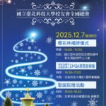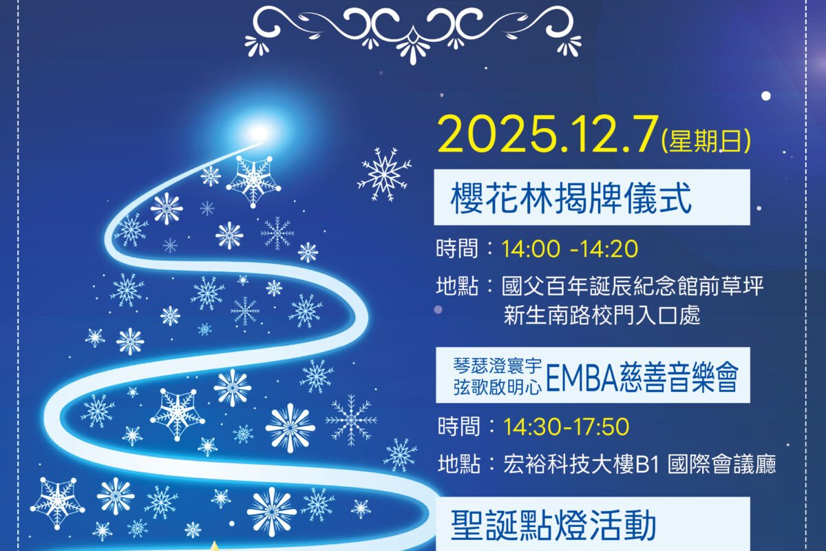 新聞 2025 年 11 月 10 日 🎄2025北科大聖誕點燈活動12.07即將溫馨登場!🎄1.櫻花揭牌儀式⏰時間:14:00~14:20 📌地點:國父百年誕辰紀念館前草坪新生南路校門入口處2.EMBA慈善音樂會⏰時間:14:30~17:45 📌地點:宏裕科技大樓B1國際會議廳3.聖誕點燈活動⏰時間:18:00~18:30 📌地點:忠孝東路與建國南路 鐘樓前※報名對象:北科教職員、校友,北科在校生,重覆登記,自動刪除※登記報名,請當日務必出席※EMBA慈善音樂會請務必報名,無報名者,無法入場。※當日無法出席,請務必於11月30日前通知北科大校友總會,電話:02-2721-3948※名額滿時,將關閉本報名表(請點文字連結) 分享